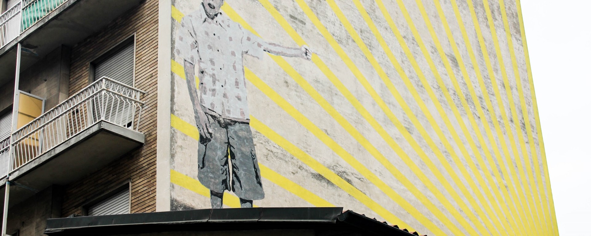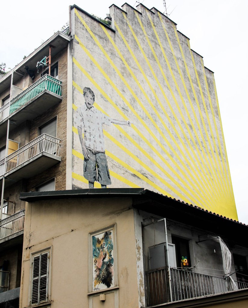 Dalla partenza potete osservare dall’alto il ► sacrario del Martinetto, quanto resta del grande edificio del Tiro a segno nazionale all’interno del quale, durante la Seconda guerra mondiale, vennero fucilato numerosi oppositori politici e partigiani dalle squadre nazi-fasciste. La lapide all’interno del sacrario ricorda 59 nomi di vittime. Se l’area è aperta potete concedervi una breve visita, altrimenti imboccate corso Svizzera e subito in piazza Perotti (dedicata proprio a uno dei comandanti partigiani fucilati al Martinetto) svoltate a sinistra in via Cibrario e subito a destra in via Locana. Siete entrati nel cuore del quartiere Campidoglio e subito ne respirate le caratteristiche: le strade strette e acciottolate, le case basse e soprattutto le numerose opere d’arte murali che compaiono qua e là sulle facciate o alle finestre. Il progetto nato e sostenuto da un’associazione locale ha costruito un vero e proprio museo, chiamato MAU – Museo d’Arte Urbana (www.museoarteurbana.it) e conta più di una cinquantina di opere, quasi tutte indicate con una placchetta e un QR-code informativo.