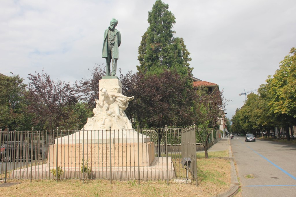 Attraversate corso Einaudi e proseguite davanti a voi in via Galliano. Siete nella Crocetta più “chic”, quella dei villini e delle ville costruite a seguito della lottizzazione della piazza d’armi nel primo Novecento. A questi edifici lavorarono i maestri del liberty piemontese tra cui Pietro Fenoglio, ma come potete osservare gli stili architettonici variano dal neogotico a costruzioni più moderne. L’atmosfera qui cambia completamente e anche i suoni della città si perdono, grazie alla vasta area pedonale che è stata ricavata tra queste vie. Osservate le architetture attorno a voi mentre proseguite su via Galliano fino a incrociare corso Duca d’Aosta. Svoltate a destra, e poi a sinistra in corso Galileo Ferraris. Sullo fondo, sopra gli alberi, potete scorgere la statua di Vittorio Emanuele II posta sulla sommità del monumento a lui dedicato. Al secondo incrocio più avanti si apre uno slarghetto da cui diramano corso Trieste e corso Montevecchio. Nel mezzo si trova il ► monumento a Galileo Ferraris, scienziato piemontese (nacque nel 1847 a Livorno in provincia di Vercelli, che per questo divenne poi Livorno Ferraris) scopritore del campo magnetico rotante. La statua fu realizzata nel 1903 e inizialmente era posta in piazza Castello, accanto a Palazzo Madama sul lato in cui ora si trova il monumento ai Cavalieri d’Italia, e fu poi trasferita qui nel 1928.