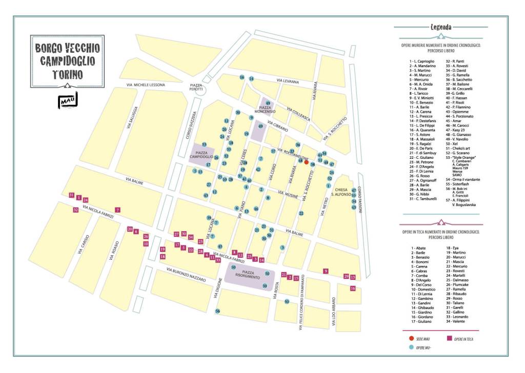 L’area ricompresa nel MAU corrisponde al nucleo antico del quartiere (vedi mappa qui in basso) e si gira molto agilmente a piedi. Gli itinerari possono essere del tutto liberi, qui se ne propone uno: da via Locana proseguite fino al primo incrocio e svoltate a sinistra in via Musiné, poi ancora a sinistra in via Fiano e a destra in via Rocciamelone. Al numero 7 della via trovate la sede centrale del Museo che è anche spazio d’arte. Arrivate al fondo e vi trovate davanti la grande ► chiesa di Sant’Alfonso, costruita a fine Ottocento da un allievo di San Giovanni Bosco. Prendete a destra via Netro – fate caso in alto attorno a voi alle opere alle finestre e sui frontespizi dei palazzi – svoltate in via Balme e arrivate all’incrocio con via Corio, dove svolterete a sinistra, sbucando in piazza Risorgimento. La piazza è abbastanza anonima ma potete curiosare negli mini-orti urbani allestiti in un angolo dello spazio.