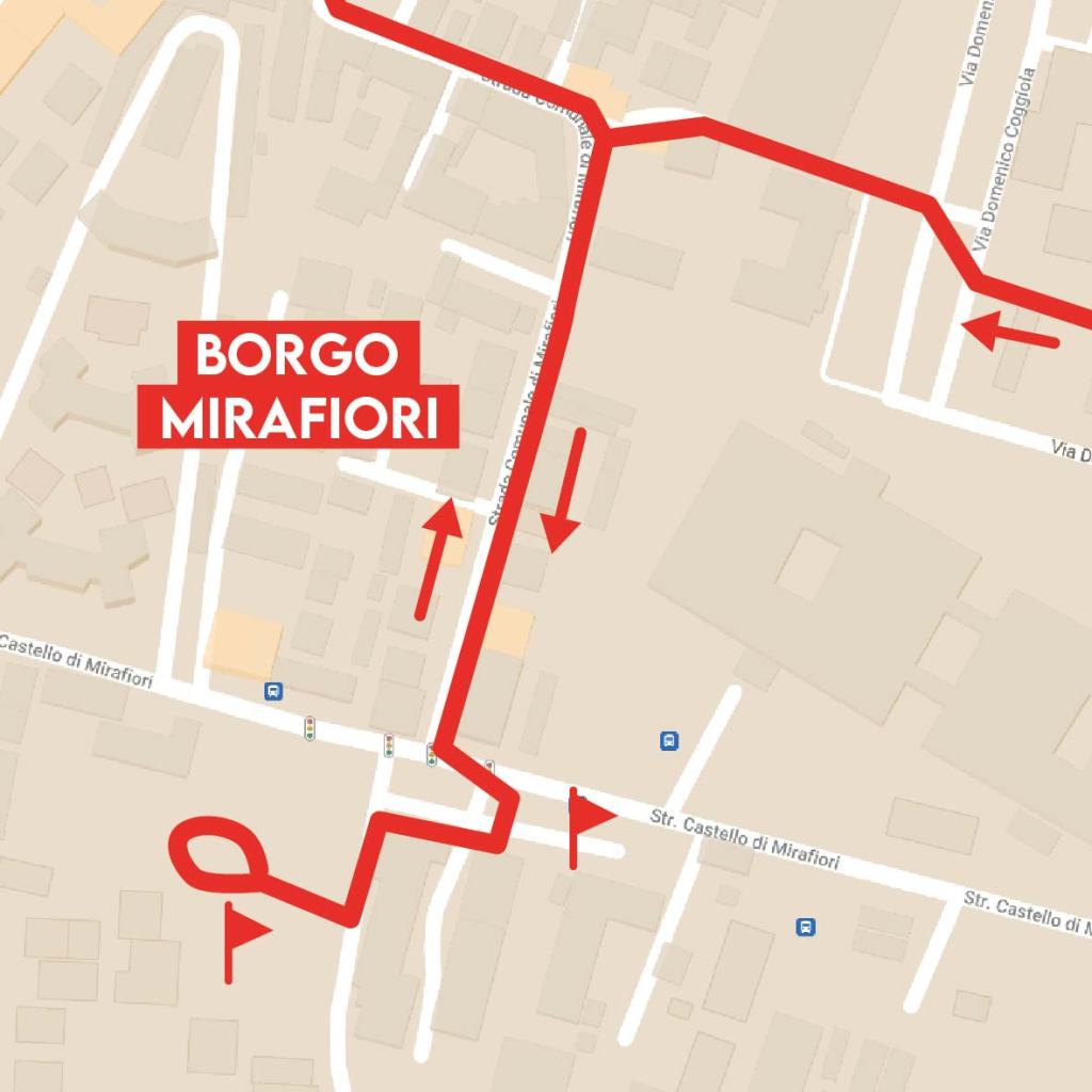 Tornate indietro seguendo la strada che avete fatto, rientrate nel borgo antico di Mirafiori fino all’incrocio con i sedili in cemento: a destra c’è la vietta da cui siete arrivati prima. Per concludere l’itinerario vi si prospettano due soluzioni.