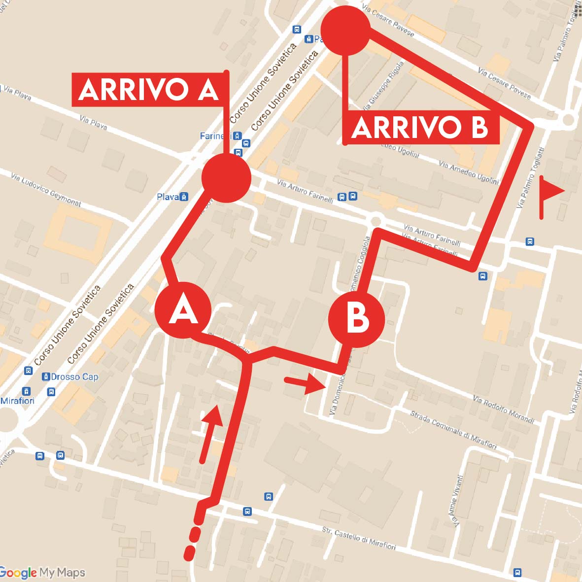 Proposta B: all’incrocio riprendete la vietta da cui siete arrivate e tornate in via Coggiola, che imboccate a sinistra. In via Farinelli svoltate a destra e poi subito a sinistra in via Togliatti, passando davanti alla ► chiesa dei Santi Apostoli. Al secondo incrocio, il viale sulla sinistra è via Cesare Pavese, via di negozi dove si tiene il mercato di quartiere. Potete percorrerlo fino in fondo e ritrovarvi in corso Unione Sovietica, a solo una fermata di distanza dall’arrivo del Percorso A.