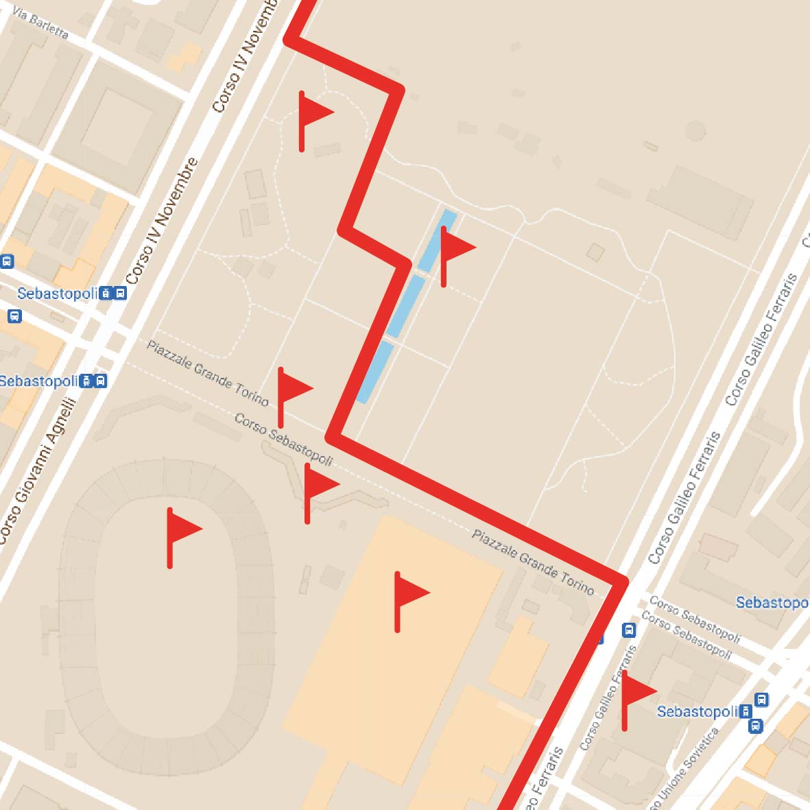 Alla vostra destra prosegue corso Sebastopoli, sede di un vivace mercato; voi invece prendete a sinistra, passando davanti al ► Pala Alpitour, sede dell’hockey su ghiaccio durante le Olimpiadi e ora di vari eventi e concerti. Arrivati su corso Galileo Ferraris svoltate a destra. Dall’altro lato del viale vedete l’► ospedale Koelliker, fondato nel 1928 dall’industriale Enrico Koelliker come primo ospedale pediatrico della città; accanto a voi invece c’è la sede della ► Fondazione Teatro ragazzi e più avanti il centro acquatico e la ► piscina monumentale, costruita insieme allo stadio.