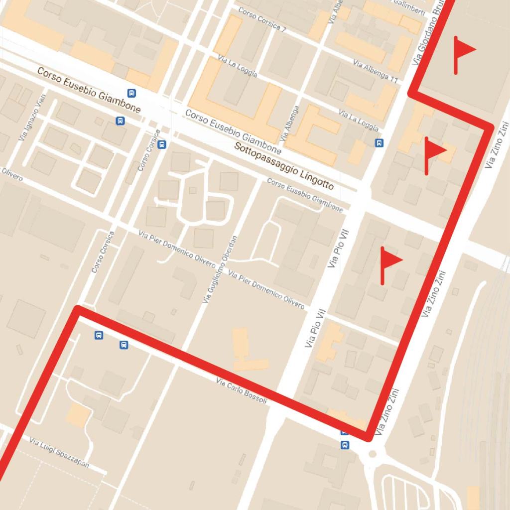 Procedete dando un’occhiata agli interni delle case più avanti – dove potrete scorgere anche orti nei cortili – e arrivate all’incrocio con via Bossoli. Al fondo a sinistra vedete il grande piazzale della stazione FS Lingotto. Svoltate a destra in via Bossoli e seguitela per tre incroci svoltando infine a sinistra in corso Corsica, che dovete seguire fino al suo termine, infilandovi nell’area verde che vi conduce a via Passo Buole. Attraversate ed entrate nel ► parco Di Vittorio. Aperto negli anni Cinquanta, il parco sorge sull’area un tempo occupata dal cimitero del borgo Lingotto. Attraversatelo in diagonale secondo il percorso che più vi piace e una volta dall’altra parte superate l’isolato di palazzi e raggiungete corso Traiano. Prendete a sinistra fino al semaforo con via Pio VII e poi a destra. Proseguite su via Pio VII fino al grande incrocio con via Onorato Vigliani.