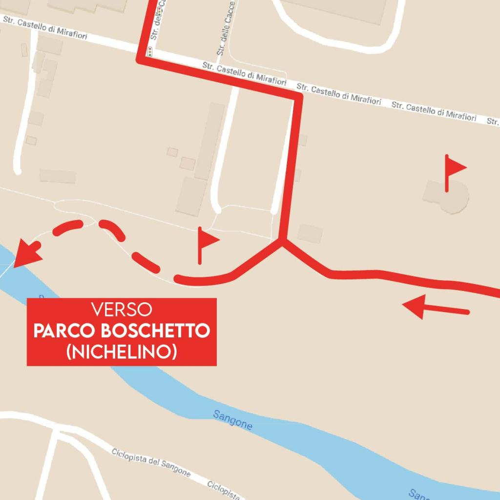 Se decideste di proseguire da questa parte vi si aprirebbe un’altra possibilità di trekking nel verde: poco più avanti una passerella scavalca il Sangone ed entra nel parco Boschetto, che si estende sui boschi appartenenti un tempo al parco del castello (e che si trovavano “al di qua” del torrente, prima che cambiasse corso) dall’altro lato del quale si trova l’abitato di Nichelino.