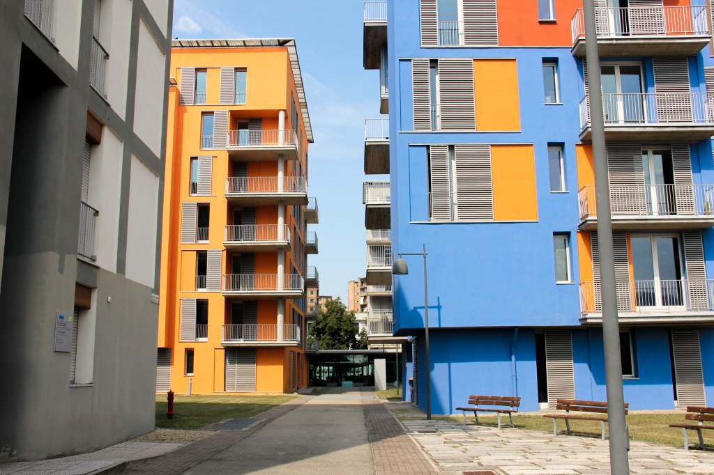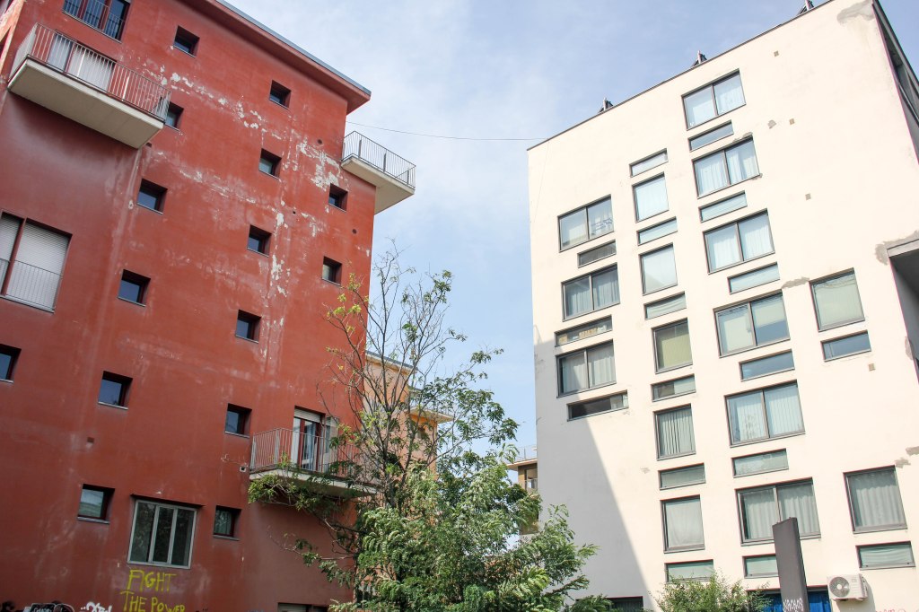 Entrambe le strutture, che fanno parte dell’ampio programma di sistemazione in occasione dei Giochi, come potete facilmente vedere hanno subito in seguito vicende travagliate e ancora non hanno trovato una sistemazione definitiva: i Magazzini attendono ancora di essere occupati e resi vivi da qualche ente o impresa, mentre per il Villaggio olimpico l’area che ora costeggiate è stata oggetto di occupazioni e solo recentemente liberata. Proseguite fino al fondo e svoltate a destra, nel vialetto tra le costruzioni del Villaggio e il muro che lo separa da via Zino Zini. Più avanti l’altra parte del Villaggio è diventata un comprensorio (chiuso da recinzione) e la differenza è evidente.