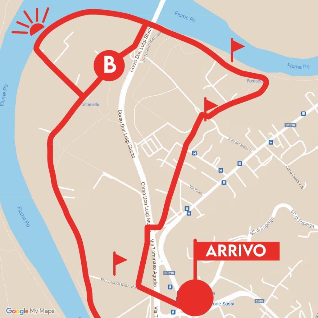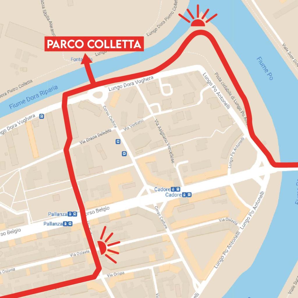 Continuate lungo via Oropa; prima passate lo slarghetto con corso Brianza e al successivo slargo svoltate a sinistra in via Pallanza. Al successivo incrocio con via Oslavia gettate lo sguardo sulla destra per ammirare la basilica di Superga che si staglia in alto, tra i palazzi. Continuate su via Pallanza, attraversate ancora corso Belgio e proseguite, imboccando il vialetto pedonale accanto alla recinzione della scuola che vi porta a un’area parcheggio tra due grossi condomini. Proseguite e arrivate al fiume, che dovete costeggiare prendendo a destra. Poco più avanti incrociate la passerella ciclopedonale che conduce sull’altra sponda al Parco Colletta, area verde e sportiva amata dai torinesi, dove potete compiere una deviazione per poi tornare a questo stesso punto. Diversamente continuate sulla pista lungo il fiume. Dove il parco si allarga, mantenetevi a sinistra; più avanti, tra le fronde, potete scorgere la confluenza tra la Dora e il Po.