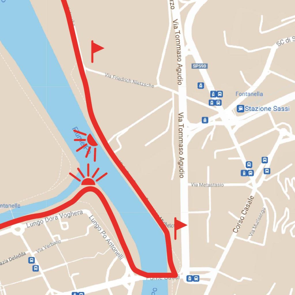 Quando arrivate all’incrocio svoltate a sinistra, riattraversate lo stradone (via Agudio) al semaforo e proseguite dritto lungo Strada del Cimitero di Sassi, che termina su corso Casale in corrispondenza dello slargo con la ► stazione della ferrovia a cremagliera per Superga. Alla vostra sinistra c’è la fermata dei mezzi per tornare verso il centro città. Diversamente da qui transita l’itinerario Lungo il Po tra Sassi e il Valentino sulla sponda destra del fiume, a cui potete ricollegarvi.