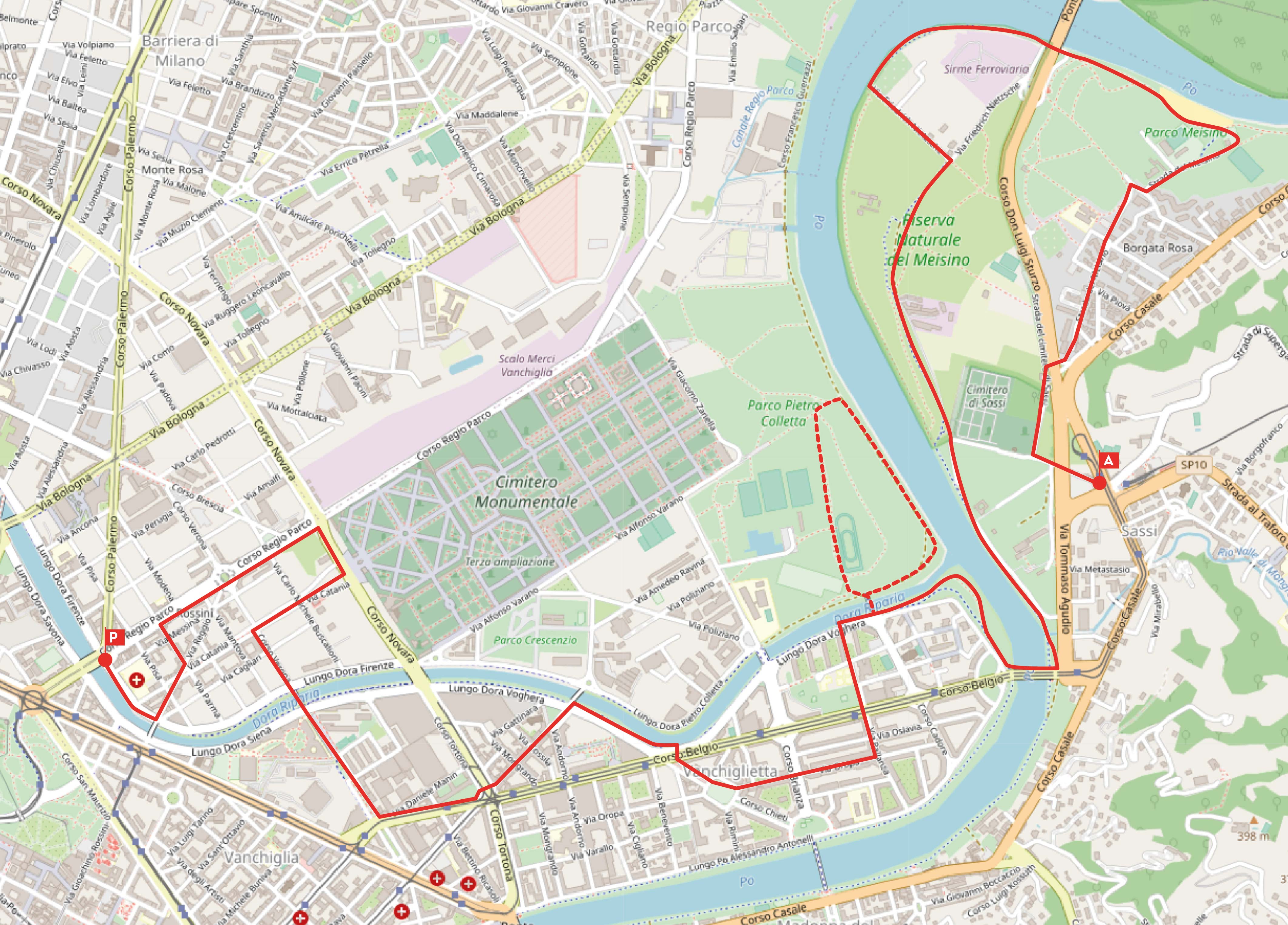 Sulla vostra destra appaiono il maneggio e poi il parcheggio della bocciofila del Meisino – che può essere un utile punto ristoro. Lasciatevi alle spalle la spiaggia e il fiume, prendete a destra, attraversate il parcheggio della bocciofila e imboccate la strada che vi arriva, costeggiando la recinzione del maneggio. Proseguendo presso un bivio quasi cento metri più avanti vi apparirà davanti la ► chiesa di Gesù maestro. Prendete a destra e poi subito a sinistra, imboccando Strada del Meisino. Andate avanti, superate la rotonda e proseguite lungo la stessa strada, che termina in uno sbarramento per le auto. Voi invece tenetevi sulla destra, attraversate sulle strisce e al semaforo passate sull’altro lato di corso Luigi Sturzo, scendendo poi il breve dislivello con la strada discendente davanti a voi, Strada del Cimitero di Sassi. Imboccatela verso sinistra e sarete presto in vista del cimitero (vi arrivate dall’angolo opposto rispetto a prima).